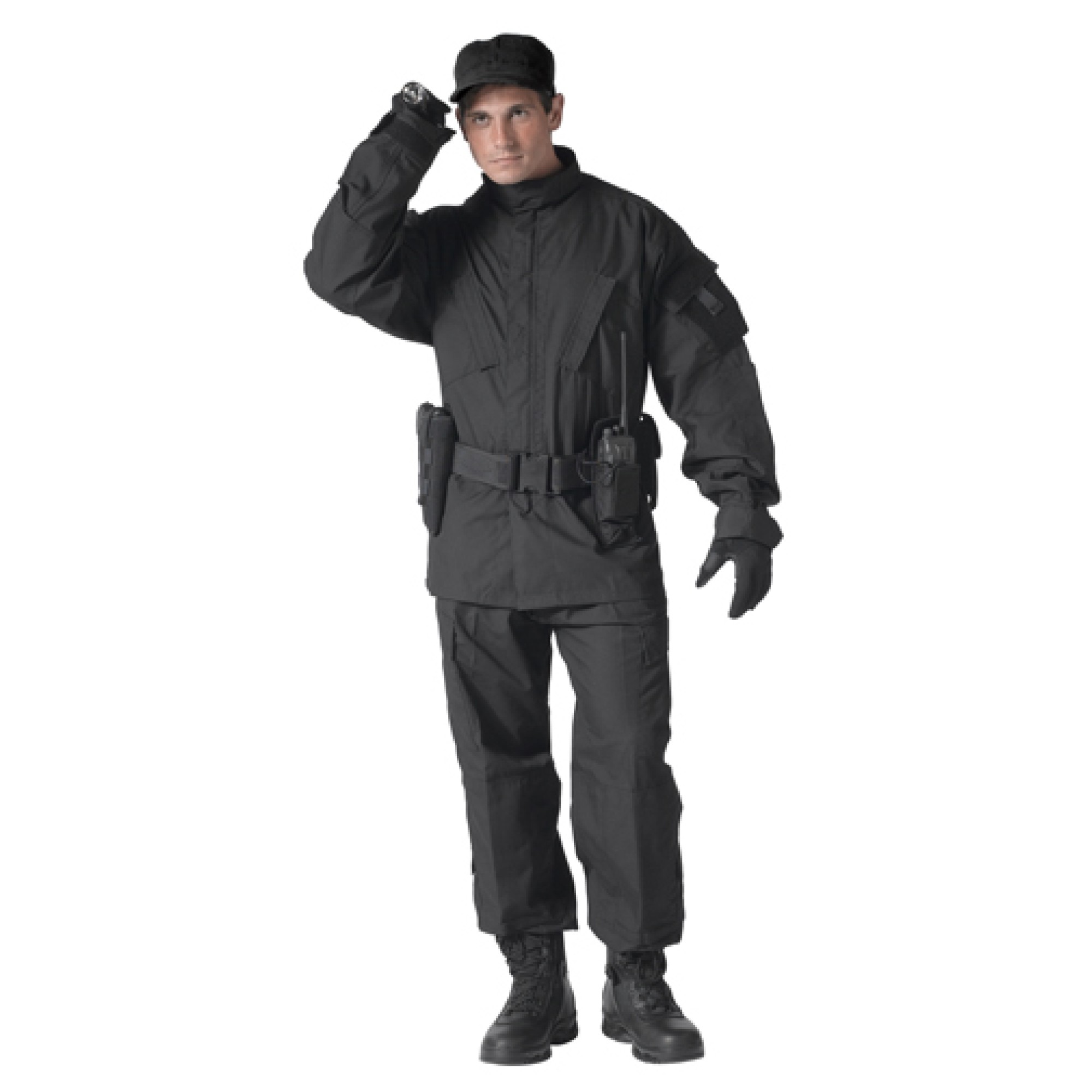 SpecificationClothing Choose Fabric Composition: 65% Polyester - 35% Cotton Color (clothing): Black Type Type: Combat Shirt Rothco's Army Combat Uniform Shirts are made to military specifications (mil-spec) and feature a mandarin collar, elbow pad pouches, hook and loop cuffs, pleated back and separate branch tape, name tape and rank insignia patches on the chest. Rothco’s combat military uniform shirts have 2 chest pockets, pen pocket and shoulder pockets