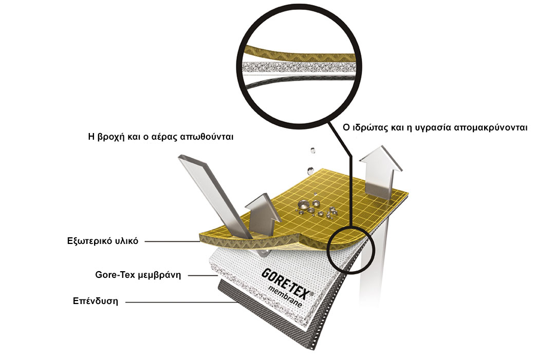 Το Gore-Tex γνωστό στην αγορά ως "Εγγυημένο να σας κρατάει στεγνούς", είναι αδιάβροχο και αντιανεμικό. Οι μικροσκοπικοί πόροι μιας μεμβράνης Gore-Tex είναι περίπου 20.000 φορές μικρότεροι από ένα σταγονίδιο νερού, που σημαίνει ότι δεν μπορεί να περάσει νερό μέσω υφασμάτων που είναι συνδεδεμένα με τη μεμβράνη. Αυτοί οι πόροι, ωστόσο, είναι 700 φορές μεγαλύτεροι από ένα μόριο ατμού υγρασίας, που σημαίνει ότι ο ιδρώτας μπορεί να διέλθει μέσω της μεμβράνης. Επιπλέον, η μοριακή δομή της μεμβράνης είναι τόσο περίπλοκη ώστε τα περισσότερα μόρια του αέρα να αποκρυπτογραφούνται και να μην μπορούν να διεισδύσουν στη μεμβράνη.