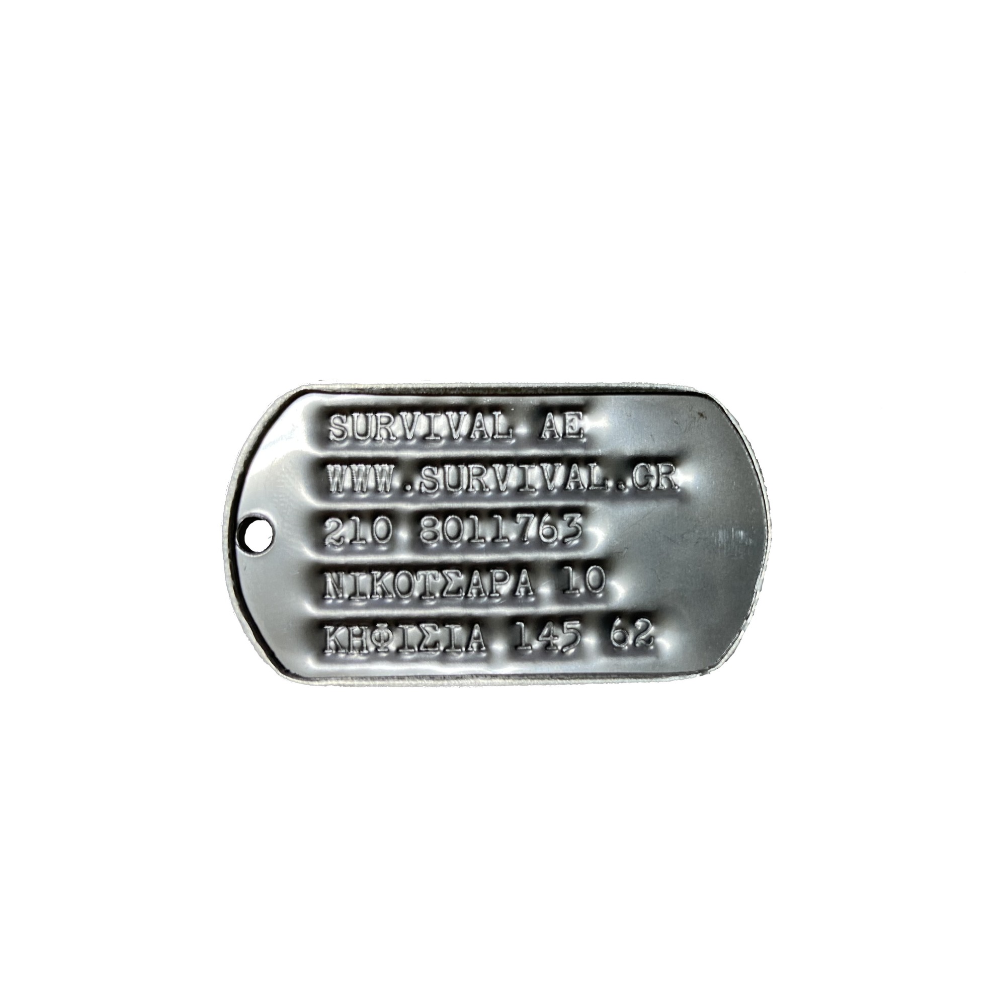 ΧαρακτηριστικάΜεταλλική ταυτότητα αναγνώρισης χωρίς αλυσίδα σε ασημένιο χρώμα. Διαστάσεις: 5 x 2,5 cm.